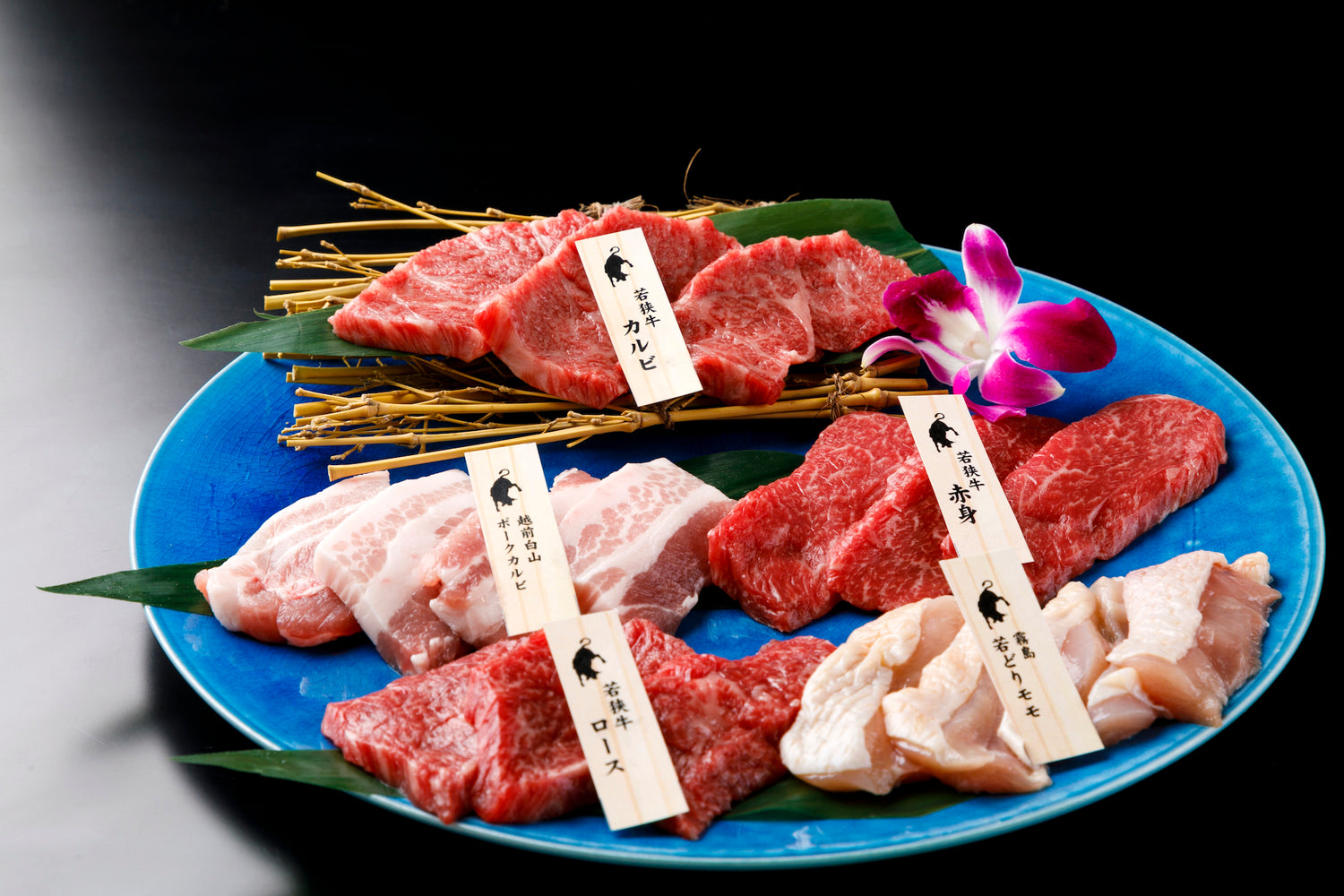 当店では、福井県を代表するブランド食材「若狭牛」を中心に、黒毛和牛の銘柄牛の中から、"その日一番"の良いお肉だけを仕入れてご提供しております。